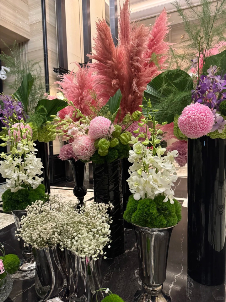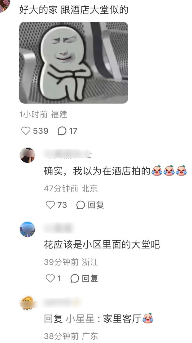 用来安放花艺的瓶罐超气派,哪怕晒出的照片只是边角,我们就可知客厅的装修非常土豪,难怪会被评论区的网友误以为是酒店大堂。